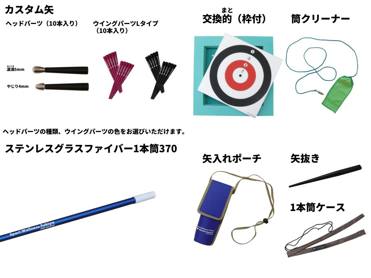 他の画像を見る 入門セット(カスタム矢+ステンレスグラスファイバー1本筒370) 価格 ¥ 35,900 税込 一般社団法人日本スポーツウエルネス吹矢協会公認の入門セットです。 初めての方でもすぐに楽しめるよう、必要な用具を一式揃えています。 詳細を見る お気に入りに登録する