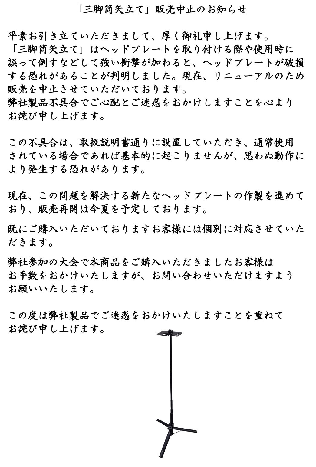 「三脚筒矢立て」販売中止のお知らせ