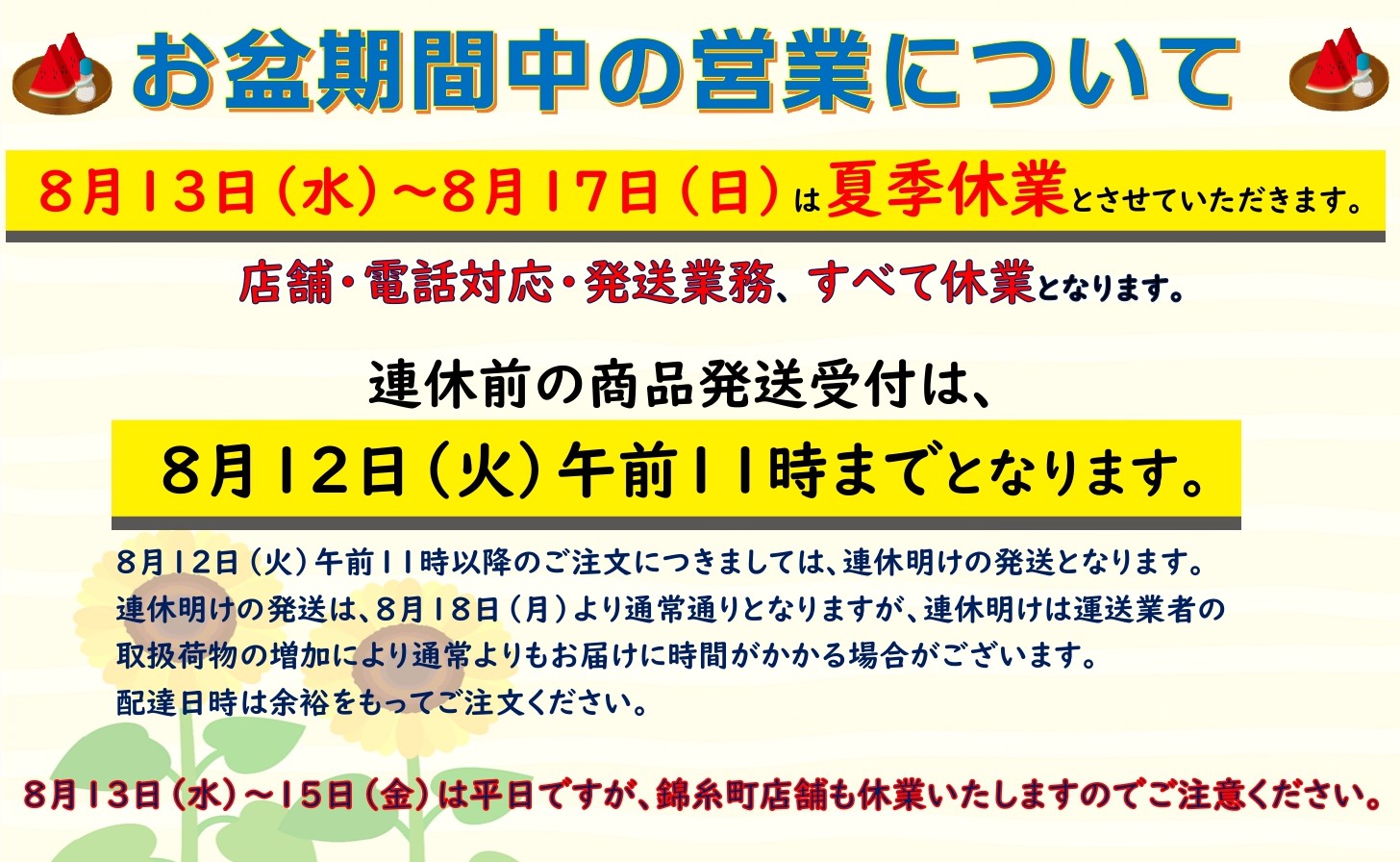 夏季休業期間中の営業についてご案内させていただきます。
